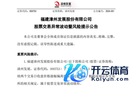 漳州发展12月5日早间表示股票交往止境波动暨风险提醒公告称,公司近期规划情况及表里部规划环境未发生紧要变化,公司提醒雄壮投资者感性方案、审慎投资,提神二级市集交往风险。公司实质鸿沟东说念主及控股激动不存在波及公司应表示而未表示或处于打算阶段的紧要事项。